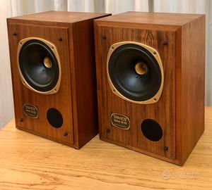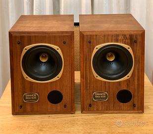 Fantastiche Tannoy Esher SL25 finitura noce naturale in condizioni pari al nuovo! Complete di tele para polvere con loghi originali pari al nuovo. Suono spettacolare con alta frequenza dettagliata e setosa e gamma medio bassa/bassissima corposa e potente con controllo assoluto! Diffusori acustici a sorgente puntiforme singola, da posizionare su scaffale o supporto complete di tele para polvere originali ed in condizioni pari al nuovo!!! Grande Woofer concentrico con unità HF raffreddata a ferrofluido del diametro di ben 23,6 centimetri !!!! (9,3" pollici). Crossover con compensazione temporale!!! Cabinet bass reflex con finitura impiallacciata in noce Potenza dell'amplificatore consigliata: 10 W - 100 W Potenza gestibile di picco: 120 W Suono spettacolare come Tannoy sa fare, preciso, veloce, dettagliato con gamma media spettacolare e gamma bassa controllatissima! TOP!!!!! Impedenza nominale/minima: 8 Ω / 6 Ω Sensibilità in camera anecoica: 93 dB Risposta in frequenza: 27Hz - 20 kHz (±3 dB) Compensazione temporale: migliore di ±30 µsec 110 Hz - 10 kHz Frequenza di crossover: 1,8 kHz Tipo di crossover: 8 elementi passivi con compensazione temporale Caricamento dei bassi: porta bass reflex offset Costruzione del cabinet: pannello di particelle ad alta densità da 18/25 mm Finitura: impiallacciatura in vero noce Griglia: monoblocco rimovibile massiccia, tessuto marrone su telaio in legno! Volume interno: 25 litri Dimensioni (L x A x P): 460 x 320 x 267 mm Peso: 16,5 kg cad. Se interessati lasciare numero telefonico. No messaggi.