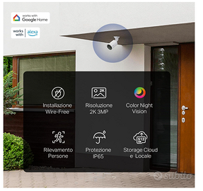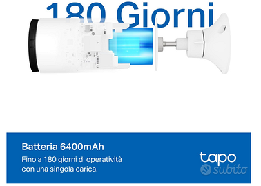 Informazioni su questo articolo Senza fili, si installa quasi ovunque: elimina la necessità di prese e consente un posizionamento flessibile. Aggiungi sicurezza alla tua casa, ovunque e in qualsiasi momento. Immagini 2K 3MP superiori: cattura ogni dettaglio con una risoluzione 2K cristallina, con algoritmi avanzati che garantiscono un'esposizione perfetta giorno e notte. Visione notturna a colori: guarda la notte con colori vivaci grazie all'obiettivo ad ampia apertura e ai faretti integrati efficaci fino a 9 metri (30 piedi). Durata prolungata della batteria: con un massimo di 180 giorni di sicurezza con una singola carica, Tapo C410 riduce al minimo la manutenzione. Opzioni di archiviazione flessibili: scegli tra l'archiviazione microSD locale fino a 512 GB o il servizio cloud sicuro Tapo Care per una maggiore tranquillità. Rilevamento intelligente delle persone: ricevi avvisi quando viene rilevata una persona, riducendo i falsi avvisi e le notifiche non necessarie. Notifiche telefono intelligenti: personalizza le zone di attività per un rilevamento preciso del movimento e avvisi sul telefono, concentrandoti su ciò che conta veramente. IP65 resistente alle intemperie: offre eccellenti prestazioni di impermeabilità e resistenza alla polvere per scenari esterni.