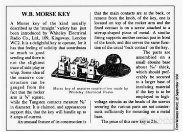 Vendo tasto telegrafico verticale degli anni 40, storico modello W.T. 8 AMP N°2 MKII, perfettamente funzionante e in ottimo stato estetico. Completo di 3 regolazioni, doppio contatto, cablabile sia da destra che da sinistra, adatto all'uso operativo per trasmissioni radioamatoriali in CW oppure come pezzo da collezione, difficile da trovare in queste condizioni ottime.