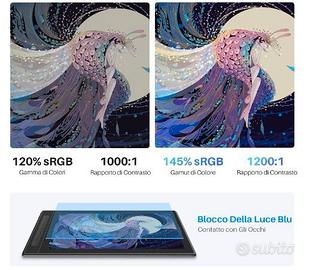 PRODOTTO NUOVO E SIGILLATO, NON VENDO MERCE USATA. Riceverete una tavola grafica da usare anche come TV, più avanti vi spiego come. Riguardo il funzionamento principale, avrete una tavola con schermo reattivo, che simula a perfezione il disegno a mano con matita, grazie alla calibrazione ad alta precisione. Il pennino ha punte di ricambio da scegliere secondo il tipo di disegno, logo o progettazione 3D che avete intenzione di riprodurre. Comandi laterali a memorizzazione, per rendere più rapido il lavoro, dunque invece di effettuare un percorso manuale per scegliere lo strumenti richiesto, come ad esempio smussatura, ritaglio o quant' altro, voi associate quel comando a un pulsante e lo eseguite più rapidamente, si tratta dunque di comandi che usate spesso per le vostre creazioni. Schermo anti luce blu, maggior sollievo per gli occhi e colori fedeli alla realtà, altro il contrasto e immagine nitida. Riguardo l'uso come display si, potete collegare questa tavola grafica ad un apparato con il cavo HDMI fornito in dotazione e potrete usarlo in 3 scenari differenti. 1 ) Estensione o duplicazione schermo del pc 2 ) Collegare una consolle per videogiochi o altri apparati di riproduzione multimediale. 3 ) Utilizzando invece il cavo USB-C potrete riprodurre lo schermo del vostro smartphone e avere una visione più grande delle vostre app e videogiochi.