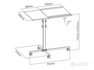 Questo carrello regolabile in altezza è molto versatile ed è dotato di un'ampia superficie per posizionare un videoproiettore e/o un notebook. Il pianale stabile è regolabile di 35°, ed i bordi rialzati impediscono al tuo dispositivo di scivolare e cadere. La base è dotata di quattro ruote per una maggior praticità negli spostamenti. E' ideale per centri congressi, alberghi, sale riunioni, aule e showroom. Caratteristiche Carico massimo supportato: 10kg Ripiani inclinabili: +/-35° Bordi rialzati per impedire lo scivolamento dei dispositivi Dotato di 4 ruote da 2", di cui 2 bloccabili Altezza regolabile: 772-872mm Superficie totale dei ripiani: 572x772mm