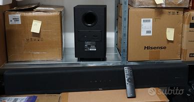 TCL Alto 8e soundbar con subwoofer in stato pari al nuovo, usata solo per prova allo scopo di redigere una recensione. Caratteristiche principali Potenza: 350 W (totale). Altoparlanti: 1 fullrange ellittico, 2 midwoofer ellittici, 2 tweeter, 2 fullrange circolari. Subwoofer: 1 woofer 13,5 cm con caricamento reflex. Ingressi: HDMI, Toslink, Bluetooth 4.2, Wi-Fi 802.11 b/g/ac dual band MIMO. Uscite: HDMI (eARC/ARC). Dimensioni: 100×6,5×12,2 cm (soundbar), 20x35x20 cm (subwoofer) Consegna a mano preferita per il peso e l'ingombro: spedizione possibile con imballo adeguato a spese e sotto l'esclusiva responsabilità dell'acquirente. Questa è una vendita tra privati pertanto non verrà fornita alcuna garanzia sulla merce né sarà possibile restituirla non valendo, per le vendite tra privati, il diritto di recesso.