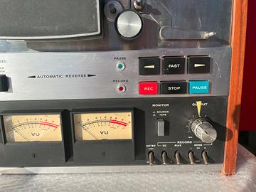 Registratore stereo, a bobine, autoreverse. Anno di produzione 1978. 4 tracce - 2 canali - 3 motori - 4 testine ( cancella - registra - riproduce - riproduce all'indietro) Bobine diametro 26,5 Velocità 19cm/s - 9,5cm/s Durata 192 minuti in entrambe le direzioni Risposta in frequenza complessiva : 9.50 cm/s 30-20000Hz 19 cm/s 30-28000Hz Fornito con 2 bobine ASC 26,5cm registrate una sola volta in alta qualità (Sinatra + autori vari jazz) + 1 flangia Maxell 35-180. Completo di istruzioni, privo dell'imballaggio originale. Dimensioni 440x520x210mm Peso 22kg (consigliabile il ritiro a mano) L'apparecchio, inutilizzato per alcuni anni, è stato recentemente revisionato. Disponibili scheda di lavorazione e fattura datata febbraio 2023, con sei mesi di garanzia.