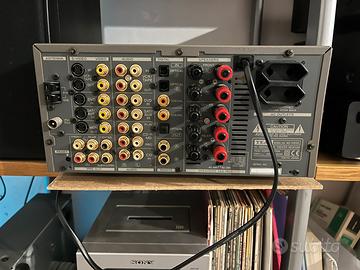 In ottime condizioni estetiche ma con un difetto: fruscio sporadico risolvibile con riavvio. Il fruscio si avverte su entrambi i canali e anche con volume a zero e su tutte le commutazioni CD/ DVD/ Tuner/ Sat etc. ivi compresa uscita cuffia. Chi lo compra è consapevole del difetto e lo acquista con la formula "visto e gradito". Assicuro che oltre questo difetto non ne presenta altri. Con telecomando originale. NO SPEDIZIONE. Solo consegna a mano. Potenza stereo (2 canali): → 80 W + 80 W su 8 Ω (20 Hz–20 kHz, 0,9% THD) Potenza multicanale (5.1): → Frontali: 55 W + 55 W → Centrale: 55 W → Posteriori: 55 W + 55 W Distorsione armonica totale: → 0,02% (stereo, 1 kHz) Risposta in frequenza: → 20 Hz – 65 kHz (+1 / −3 dB) Rapporto segnale/rumore: → 85 dB (line) Controlli di tono: → Bassi: ±10 dB (100 Hz) → Alti: ±10 dB (10 kHz) Dolby Digital (AC-3) Dolby Pro Logic DTS Modalità DSP: → 4 ambienti (Theater, Hall, Stadium, Disco) Ritardi canali (delay): Dolby Digital: → Rear: 0–15 ms → Center: 0–5 ms Pro Logic: → Rear: 15–30 ms Convertitore D/A: 24 bit / 96 kHz Frequenze di campionamento supportate: → 32 / 44,1 / 48 kHz Ingressi digitali: Coassiale (RCA) Ottico (TOSLINK) 📡 Tuner radio integrato FM: 87,5 – 108 MHz AM: 522 – 1620 kHz Memorie: fino a 30 stazioni Audio Ingressi analogici: CD, DVD, SAT/AUX, VCR, CD-R/MD Uscite: Pre-out (front, center, surround, subwoofer) Tape/rec out Video Ingressi/uscite composito e S-Video Monitor out Diffusori Terminali per: Frontali L/R Centrale Posteriori L/R Alimentazione: 230 V AC (versione EU) Consumo: circa 340 W Dimensioni: 285 × 145 × 394 mm Peso: ~9,4 kg
