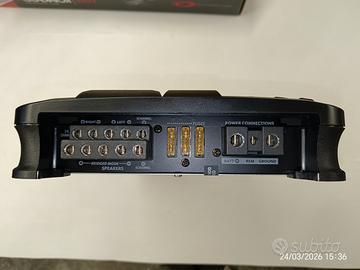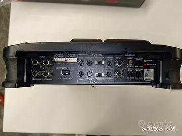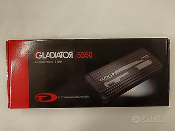 TEC NEGOZIO VENDE VERO AFFARE amplificatore stereo 5 canali GLADIATOR 5350 CON UN SOLO AMPLIFICATORE FAI IL TUO IMPIANTO Classe AB Full Mosfet a 5 canali stabile su 2 ohm in classe AB - Max Power 700 W Connettori di ingresso NI plated - Auto switching Hi-Level input RMS @ 2ohm 70W x 4 + 210W x 1 - RMS @ 4ohm 50W x 4 + 150W x 1 Bridged 130W x 2 Dimensioni in mm: 58x460x223 (DxLxH) Potenza 4 x 70 Watt RMS + 1 x 210 Watt RMS su 2 ohm 4 x 50 Watt RMS + 1 x 150 Watt RMS su 4 ohm Caratteristiche principali: Full Mosfet a 2 canali stabile su 2 ohm Classe AB Tri-mode Bass boost (45 Hz) regolabile da 0 a 12 dB Gain Control regolabile da 0,25 a 8 volt Crossover passa-alto variabile da 50 a 500 Hz - 12 dB/oct Crossover passa-basso variabile da 50 a 500 Hz - 12 dB/oct Risposta in frequenza da 10 Hz a 35.000 Hz Connettori di ingresso NI plated Auto switching Hi-Level input Dimensioni in mm: 223x58x460 (W H L)
