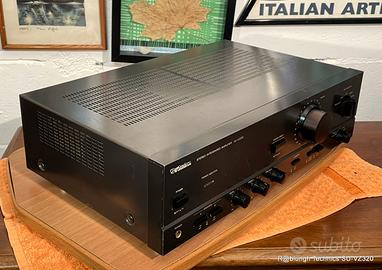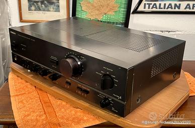 In buone condizioni estetiche e perfettamente funzionanti Fa parte della serie NewclassA progettata per consentire di avvicinarsi ai suoni di classe A.: In buone condizioni estetiche, pochi segni sugli spigoli e sul coperchio, il frontale in alluminio color bruno ha tutte le scritte perfettamente leggibili anche se precedenti pulizie maldestre hanno lasciato aloni e scoloriture e una piccola riga non molto evidente. Tutte le manopole in plastica tranne quella del volume in alluminio e tutti i pulsanti non hanno segni apprezzabili Appena pulito Tutti i potenziometri e i commutatori sono stati disossidati, completamente originale,. perfettamente funzionante nessun rumore dai potenziometri all’interno non si notano tracce di perdite dai condensatori, ne segni di interventi di riparazione Potenza in uscita: 40 watt per canale in 8Ω (stereo) Risposta in frequenza: da 20Hz a 20kHz Distorsione armonica totale: 0,2% Fattore di smorzamento: 40 Rapporto segnale-rumore: 76 dB (MM), 90 dB (linea) Separazione canali: 50 dB (linea) Dimensioni: 430 x 125 x 320 mm Peso: 7,3 kg Entrate: Phono MM; Tuner; CD, Aux e 2 Tape/dat Uscite:, 2 coppie di altoparlanti e cuffia Controlli: Bass, +/- 10 dB a50 Hz; Treble 20 kHz, +/- 10 dB, a 20 kHz e balance con line direct per la loro esclusione, comandi per loudnes, mono/stereo e filtro subsonico