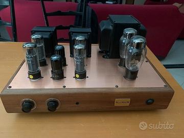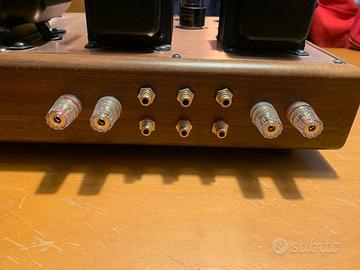 Come si puo notare questo modello monta 4 valvole el 34 e non due , con una potenza di 25 w per canale sufficienti a pilotare diffusori da 90db in su Compreso nel prezzo coppia RCA 6SN7 GTB e quartetto GENALEX GOLD LION KT77 ( usate pochissimo) Completo di telecomando e sacca nera con cui mi è stato consegnato dal costruttore ; in caso di spedizione garantisco imballaggio adeguato anche se dato il peso è preferibile il ritiro . Non accetto permute Pagamento PAYPAL + 4%