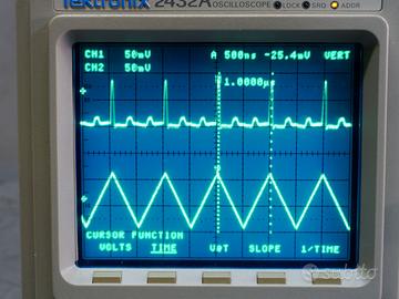 TEKTRONIX 2432A OSCILLOSCOPIO 300 MHz 250 MS/s Il Tektronix 2432A è un oscilloscopio digitale con una larghezza di banda di 300 MHz e 2 canali. Il 2432A funziona come un oscilloscopio analogico, ma consente di risparmiare tempo grazie alle nuove funzionalità automatizzate Condizioni spettacolari, funziona perfettamente, completamente verificato, questo modello ha il grandissimo vantaggio di non montare le DALLAS ma ha una batteria di backup ancora carica con 3,5 Volt. Ho messo alcune foto per capirne meglio le condizioni, per farle ho aumentato un pò la luminosità. Corredato del grosso manuale d’uso di 480 pagine, manuale breve originale. Cd (QService) con tutte le informazioni, coppia sonde nuove 100MHz x1 x10, morsetto a vite per collegamento di massa