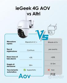 Proteggi ogni spazio con la telecamera 4G ieGeek da esterno con tecnologia AOV (Always On Video): 1 foto ogni 2 sec (regolabile fino a 1 fps) e registrazione automatica al rilevamento persone, evitando video incompleti. Compressione H.265 e supporto TF fino a 512GB per archiviazione sicura a lungo termine.