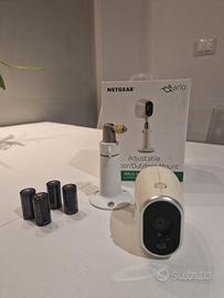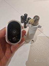 Sistema di videosorveglianza WiFi con videocamera IP senza fili, a batterie e qualità video HD, inclusa stazione base e supporto.
