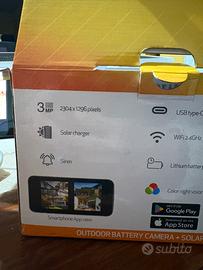 Telecamera da esterno compresa di pannello solare, Wi-Fi, visione colori notturna, attacco USB-c, allarme. Controllabile da cellulare.