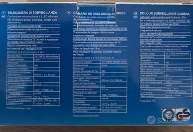 Telecamera con funzione notturna e 8 led infarrossi,per interni o esterni (IP44), immagini a colori,microfono integrato, trasmissione su ricevitore tv-monitor o registratore con entrata video,cavo di collegamento 18 metri. Altre specifiche nella foto