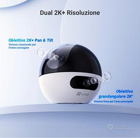 Telecamera di sorveglianza interna EZVIZ C7 con risoluzione 4MP e doppia lente. Offre una visione a 360° ed è dotata di rilevamento di persone e animali.
