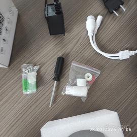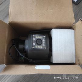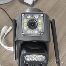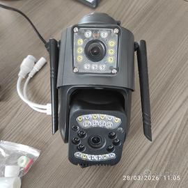 Telecamera WiFi wireless smart net camera. Telecamera da esterno resistente all'acqua IP66 e con 2 obbiettivi (3,6 mm, 6 mm), infrarossi per visione notturna, potenti led , microfono e cassa. Un obbiettivo fisso e uno che ruota a 360°. Dotata di antenna 5DB, adatta per WiFi a 2,4 GHz, che fornisce una connessione WiFi flessibile, stabile e veloce e comandabile con app V380 a distanza. Cavo Lan. Sensore di movimento diurno e notturno, supporta la condivisione multiutente. Presente slot per micro SD (max 128gb). Nuova, tirata dallo scatolo solo per testarne il funzionamento. Compreso nello scatolo originale, giravite, tasselli e viti, alimentatore.