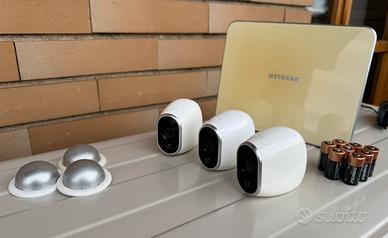 Vendo kit composto da 3 telecamere di video sorveglianza Netgear Arlo, completo di base, 3 supporti magnetici da muro e alimentatore.