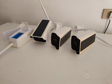 Telecamere con pannello solare integrato per la ricarica delle batterie. Perfettamente funzionanti, necessitano solo della sostituzione delle batterie tampone o di essere collegate tramite un alimentatore acquistabile separatamente. Si collegano alla rete internet domestica tramite WiFi ed è così possibile monitorare gli ambienti da remoto tramite app. Hanno audio bidirezionale e visione notturna. Vendibili anche separatamente al costo di 25 euro.