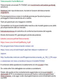 TELECOMANDO UNIVERSALE FACILE MELICONI FUNZIONANTE COMPLETO DI MANUALI, PROCEDURE, CONFIGURAZIONI ONLINE (vedi immagine) OGGETTO IN FOTO, OTTIME CONDIZIONI. CEDO CAUSA PULIZIA ARMADI.