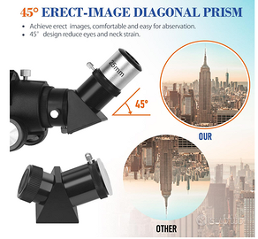 - Alto Ingrandimento: Il telescopio astronomico è dotato di due oculari intercambiabili (25 mm e 10 mm) per un ingrandimento di 24X e 60X. La lente di Barlow 3x triplica la potenza di ingrandimento di ciascun oculare. L'ingrandimento arriva a 72 o 180 volte. Con uno specchio zenitale, fornisce un'immagine eretta anziché capovolta, consentendo una migliore visione di splendidi paesaggi. Inoltre, il cannocchiale 5x24 facilita la localizzazione degli oggetti.
