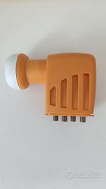 Convertirore LNB quattro, con 4 uscite, ognuna con una combinazione di polarità/banda fissa (Ha, Hb, Va, Vb). Ogni uscita è segnata con un colore: nero per Vb, rosso per Va, giallo per Ha e verde per Hb.