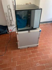 Il Brionvega Cuboglass é stato progettato da Mario Bellini nel 1992 sulla base di un ri-lavoro della St 201 dal 1969 che era un disegno del Zanuso/Sapper. É un oggetto da collezione presente nelle gallerie di vari musei. Il televisore é con il suo telecomando ed é racchiuso nella sua scatola d’alluminio d’origine che misura h. 43 x 44.5 x 44.5 cm.
