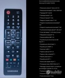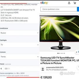 TV LED FULL HD, SAMSUNG T22A350, monitor PC. LA TV DIVENTA SMART con Amazon Fire TV Stick in ingresso HDMI. 21,5", 54,6 cm. LCD FULL HD, 16,78 milioni di colori. 16:9. Risoluzione 1980 x 1080 pixel. Connessione per pc, internet accessibile con computer. La tv si può facilmente rendere smart. La soluzione più immediata è collegare un dispositivo di streaming tramite una porta HDMI. Il T22A350 dispone di ingressi HDMI insieme ad altri connettori; questo ti permette di collegare uno o più dispositivi in base alle tue esigenze. Amazon Fire TV Stick. Offre un’interfaccia intuitiva, supporta numerose app (Netflix, Prime Video, Disney+, ecc.) è una chiavetta che funziona facilmente anche in ambienti con connessione Wi-Fi. Funzionante come da immagini. Stima del valore in immagine. Prezzo coerente con la stima. Connessione antenna TV. Il televisore presenta i fori per essere appeso a muro. Con sostegno originale samsung, telecomando in dotazione. In perfette condizioni come nuovo. Spedizione disponibile Oppure consegno a TRENTO