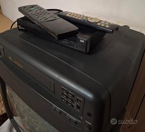Questo è un televisore a tubo catodico (CRT) vintage con videoregistratore VHS integrato di marca Daewoo. Tipologia:TV combinata con lettore VHS incorporato. Caratteristiche:Dispone della tecnologia "Digital Auto Tracking" per migliorare la qualità di riproduzione delle cassette. Stato:Oggetto da collezione, probabilmente prodotto tra gli anni '90 e i primi anni 2000.