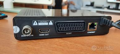 Televisore con schermo largo 34 cm ed al to 19 cm dotato di cavi da rete ad alimentatore e da alimentatore a televisore, di decoder, di cavo HDMI per collegamento tra decoder e televisore, dei telecomandi del televisore e del decoder