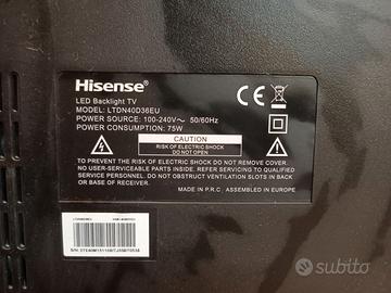 Possibilità di ritiro in Marche, Umbria e Toscana. Vendo televisore Hisense da 40 pollici di colore nero perfettamente funzionante. Il televisore viene venduto senza piedini in quanto fino ad oggi appeso al muro con supporto a farfalla. Vendo con telecomando originale. Possibilità di associare Firestick Amazon all’acquisto (con tutti i cavi necessari) per rendere la tv smart a tutti gli effetti. Ottima anche per seconda casa. - Solo tv 120 euro trattabili - Con Firestick Amazon e relativo telecomando 140 euro trattabili. Di seguito indico le specifiche tecniche: Hisense LTDN40D36EU. Dimensioni diagonale schermo: 101,6 cm (40"), Tipologia HD: Full HD, Risoluzione del display: 1920 x 1080 Pixel. Colore del prodotto: Nero, Panel mounting interface 24/5000 Interfaccia per montaggio a pannello: 200 x 200 mm. Televideo: 1000 pagine. Potenza in uscita (RMS): 16 W, Sistema audio: NICAM/A2, Formato audio integrato: Dolby Digital, Dolby Digital Plus. Consumi: 75 W, Consumi (modalità stand-by): 0,5 W, Tensione di ingresso AC: 100 - 240 V