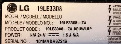 Vendo televisore LG HD 19 pollici a LED modello 19LE3308 completo di alimentatore, telecomando e piedistallo; usato nella seconda casa vacanze, perfettamente funzionante.