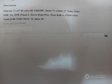 Televisore nuovo Hisense 43 pollici 4k ultra HD smart tv luglio 2025