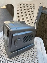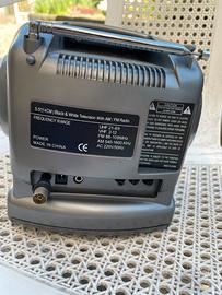 televisore portatile vintage, anni ‘90, Electro Brand con schermo in bianco e nero da 5 pollici e radio AM/FM integrata. •Schermo: 5 pollici, bianco e nero (CRT). • Funzioni: Televisore con ricezione VHF (bassa e alta) e UHF, radio AM/FM. • Alimentazione: AC, batteria o adattatore per auto da 12 Volt. • Controlli: Manopole per sintonizzazione radio, volume e selettore TV/Radio.