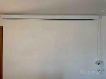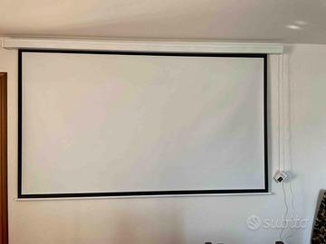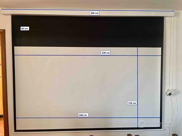 vendo per inutilizzo ottimo telo per proiezione da 108" utili formato 16:9 in PVC telato e lavabile installabile sia a parete che a soffitto. Dotato di telecomando e pulsantiera manuale. Fine corsa di salita e discesa regolabili. Le misure di ingombro sono nelle foto allegate. Come nuovo; è stato fatto funzionare solo alcune volte. NESSUN ODORE DI PLASTICA. Non spedisco per motivi di ingombro e rischio di danneggiamento considerando la larghezza.