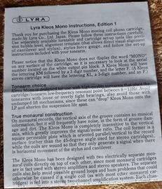Rara Testina Lyra Kleos Mono, versione speciale per la lettura dei dischi mono. Traccia senza problemi anche i dischi stereo, ma li riproduce in mono.