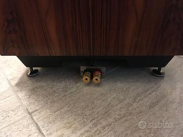 Migliorate aggiungendo sottopunte con cuscinetti di teflon alle loro punte originali, il che le rende facilmente spostabili. Aggiunte anche le prolunghe per collegare facilmente i morsetti (che sono sotto il pavimento della cassa). In questo modo non è necessario adagiare le casse sul fianco ogni volta per collegarle/scollegarle. Prolunga fatta con cavo Sommer da 6 mm e connettori Oelbach (v. foto). Funzionamento perfetto, qualche piccola scalfittura poco visibile. Punte originali e istruzioni accluse.
