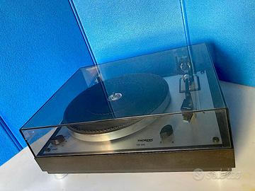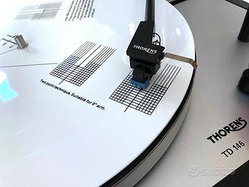 Il TD 146 è il punto d'incontro perfetto tra la meccanica pura degli anni '70 e l'elettronica di servizio degli anni '80. Non è solo un pezzo di storia, ma una macchina da musica è stata ben tarata, pertanto non ha nulla da invidiare a giradischi moderni che costano tre volte tanto. Il giradischi è in condizioni strepitose, per essere una macchina da musica con circa cinquanta primavere, cinghia nuova originale, coperchio integro e lucidato a specchio, piedini in alluminio pieno sospesi in gomma, se proprio vogliamo trovare un difetto, o meglio qualcosa da migliorare, sarebbe la sostituzione della testina, che volendo posso fornire una SUMIKO OLYSTER con l’aggiunta di 70 euro, naturalmente montata con tutte le regolazioni che merita, il giradischi è corredato da libretto di istruzioni originali cartaceo. ECCO LE CARATTERISTICHE TECNICHE: Sistema a Controtelaio Sospeso (Il "Cuore" Thorens) Il TD 146 eredita la leggendaria architettura a tre molle. Risultato: Questo sistema "filtra" le vibrazioni del motore e i passi sul pavimento, regalando quel suono tipico Thorens: arioso, tridimensionale e molto musicale, con un rumore di fondo quasi nullo. Braccio (Serie TP) il TD 146 monta il braccio TP 11 progettato con un sistema di cuscinetti a basso attrito. A massa molto bassa ~7,5 g, compatibilità ideale: testine ad alta cedevolezza (tipicamente MM anni ’70-’80) L'Automazione "Intelligente" (Auto-Stop) È la caratteristica che lo eleva rispetto al TD 166. Sensore Optoelettronico: A differenza dei giradischi economici, il TD 146 non usa leve meccaniche che toccano il braccio (compromettendone la libertà di movimento). Usa un sensore ottico che rileva la velocità di spostamento del braccio a fine disco.Quando il disco finisce, il motore si spegne e il braccio si alza. È l'eccellenza della comodità senza sacrificare la qualità sonora. Motore e Trasmissione a Cinghia Sincrono a 16 poli: Il motore è un capolavoro di precisione tedesca, estremamente silenzioso.