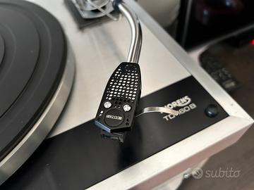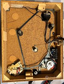 Giradischi Thorens TD 160B con braccio SME 3009 S2 Improved con cavi originali. E’stato tutto revisionato, dalle molle, con sostituzione delle spugne prodotte da Audiosilente, a tutto il resto della componentistica. La puleggia e’ in metallo, capolavoro di micromeccanica, sempre prodotta da Audiosilente. Anche la cinghia e’ nuova, di Audiosilente ed e’ perfetta per evitare la noiosa mancata presa dei 45 giri. Telaio e contro telaio sono stati insonorizzati con una lastra di sughero per ridurre al minimo le risonanze indesiderate. I piedini, tallone d’achille dei Thorens con plinto originale perche sono piccoli e tendono a sgretolarsi, sono stati sostituiti con piedini cromati larghi 4,5 cm per 1,5 cm di altezza.
