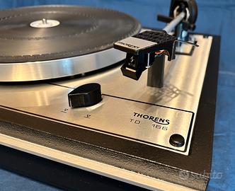 Thorens TD 166 revisionato in ogni sua parte. Questo modello e’ provvisto di motore con frizione identico a quello del TD 160, niente a che vedere con il motore semplice del TD 165. Cinghia nuova audiosilente. Testina Shure M75b con stilo in perfette condizioni. Piatto lucidato a effetto satinato. Pozzetto oliato come da manuale. I punti critici sono stati disossidati con sostituzione degli attacchi RCA. Fondello in MDF con tre fori per la regolazione delle molle e con piedini cromati maggiorati. Il coperchio in nero fume’, nuovo, fatto fare da un artigiano e ancora avvolto dal nylon protettivo, e’ compreso nel prezzo. Solo consegna a mano dopo prova di ascolto. Se guardate negli altri miei annunci ho altri modelli interessanti di Thorens della mia collezione che ho portato avanti negli anni con tanta passione. Grazie dell’attenzione