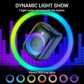 Spettacolo di luci dinamico: la divertente luce ad anello e il fantastico effetto stroboscopico si sincronizzano con il ritmo della musica rendendo ancora più appassionante il tuo karaoke. Sorprendi i tuoi ospiti con questi splendidi spettacoli di luce RGB multicolore. Grazie alla lunga durata della batteria (8 ore) e al design portatile, puoi portare il sistema karaoke anche all'esterno, a bordo piscina, in campeggio o in spiaggia.