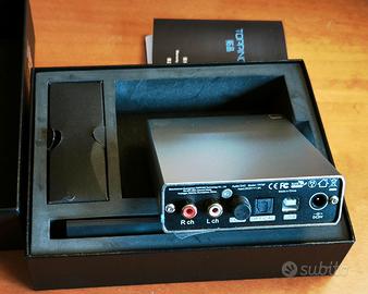 Convertitore DAC di alta qualità, usato pochissimo, condizioni estetiche e di funzionamento pari al nuovo, vendo per cambio configurazione. Verrà spedito nella confezione originale inserita in imballo esterno protettivo. All'interno della confezione originale l'apparecchio, il telecomando IR, il cavo di alimentazione (si alimenta via USB come un cellulare) , il manuale d'uso.