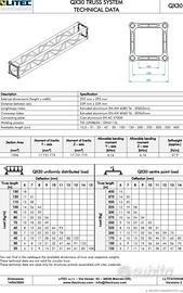 Vendo blocco indivisibile di 3 tralicci in alluminio LITEC QX30S della serie QX. o Quantità: 3 pezzi o Lunghezza di ogni traliccio: 300 cm (3 metri) o Lunghezza Totale: 9 metri o Condizione: Ottime condizioni, pronti all'uso. o Motivo della vendita: Immediato realizzo (Vero Affare). ATTENZIONE: La vendita è intesa ESCLUSIVAMENTE per il lotto completo di 3 pezzi. Non si accettano proposte per l'acquisto di singoli tralicci. Specifiche Tecniche Il traliccio LITEC QX30S è un modello standard professionale a sezione quadrata (29 cm di lato), ideale per strutture da palco, eventi, fiere e installazioni fisse. o Marca/Modello: LITEC QX30S o Sezione: Quadrata (29 x 29 cm) o Materiale: Alluminio EN AW 6082 T6 o Tubi Correnti (A): Tubo estruso Ø 50 x 2 mm o Diagonali (B): Tubo estruso Ø 18 x 2 mm o Sistema di unione: Conico (compatibile con i sistemi standard del settore). Logistica e Spedizione ? Il prezzo indicato non include la spedizione. o Spedizione: Da concordare. o Costo Spedizione: Il costo indicato è indicativo. Prego gli interessati di contattare per il calcolo preciso, poiché il costo finale dipenderà dal corriere e dalla destinazione. Contattatemi per maggiori dettagli o per organizzare il ritiro/spedizione.