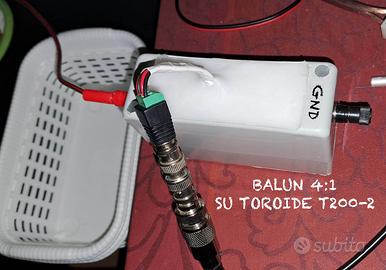 BALUN 4:1 Trasformatore d'impedenza tramite toroide T200-2 per antenne filari. E' possibile collegare un cavo coassiale tramite connettore BNC, sulla presa rossa si può collegare un cavo di lunghezza indefinita e se si preferisce si piò anche mettere un cavo di terra GND sullo spinotto nero. Il tutto ovviamente sarà poi rifinito dall'accordatore della radio. Possibile usarlo anche in trasmissione fino a 150 Watt. Trattasi di strumento autocostruito da radioamatore e già testato. Spedizione gestita da Subito.it. Per la ricerca annuncio Yaesu, Kenwood, Icom, Antenna.