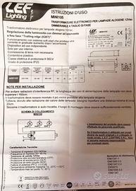 Trasformatore Elettronico 35-105W, Easyteq, mod. ETQMINI105, Tensione primaria: 230V, Frequenza: 50 Hz, Temperatura ambiente massima: 40°C, Distanza dal corpo illuminante: 20/200 cm, Classe elettrica di protezione: II, Regolazione della luminosità con dimmer a IGB, n.2 disponibili, 4,5 € l’uno