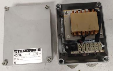 Con custodia stagna , potenza 90 VA alimentazione 220 V 50 Hz protetta con fusibile da 1A Uscita 24 VAC peso KG 4.2