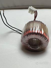 Trasformatore toroidale vintage. Primario 220 V 50 Hz secondario 12 V 50 Watt. Diametro esterno 60 mm, diametro interno 23 mm, altezza 50 mm, peso 570 g. Disponibili varie unità.
