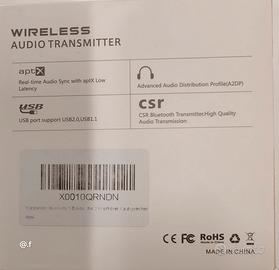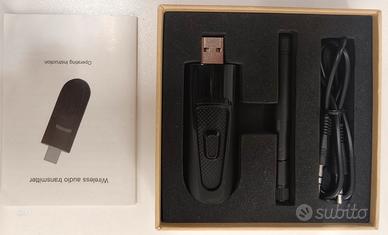 Benvenuti al trasmettitore audio wireless USB! Il chip di questo prodotto è dotato di un circuito di trasmissione integrato per migliorare il segnale, che garantisce una connessione veloce, una trasmissione a lunga distanza, un suono stabile e continuo, nonché un'ottima qualità audio. Tutto ciò consente di utilizzarlo in modo più comodo e veloce. Questo prodotto è facile da usare e può inviare liberamente tutto l'audio. Tramite questo prodotto, l'audio da PC, TV, lettore CD, MP3 o qualsiasi altro dispositivo può essere inviato a altoparlanti o cuffie con funzione Bluetooth. Poiché adotta anche la tecnologia a bassa latenza APTX LL, supporta anche la trasmissione audio in tempo reale di giochi online, TV e film. 1. Specifiche del prodotto: Nome del prodotto: Trasmettitore audio wireless Porta di ingresso: USB/AUX Distanza di trasmissione: > 10 metri Gamma di frequenza: 2,402 GHz-2,480 GHz Protocolli supportati: aptX LL, aptX, SBC, A2DP, AVRCP Alimentazione del dispositivo: USB 5V Supporta la connessione simultanea di due cuffie stereo Interfaccia utilizzata per collegare il trasmettitore alla porta USB del computer o all'interfaccia USB 5V dell'alimentatore. Si avvia direttamente quando inserito e collegato. (Nota: quando l'interfaccia USB è collegata al PC, è possibile riprodurre musica)