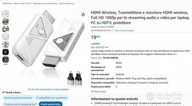 Nuovo ancora imballato, mai aperto. Acquisto errato su Amazon ma non ho fatto in tempo a restituirlo. Pagato 79,99 euro, nelle foto c'è lo screenshot della pagina Amazon, potete cercarlo su Amazon per tutte le caratteristiche. Disponibile per qualsiasi info. HDMI Wireless, Trasmettitore e ricevitore HDMI wireless, Full HD 1080p per lo streaming audio e video per laptop, PC su HDTV, proiettore. Marca PWAY.