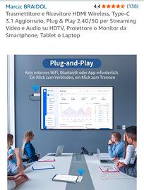 Trasmettitore e Ricevitore HDMI Wireless, Type-C 3.1 Aggiornato, Plug & Play 2.4G/5G per Streaming Video e Audio su HDTV, Proiettore o Monitor da Smartphone, Tablet o Laptop.