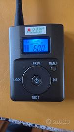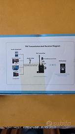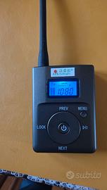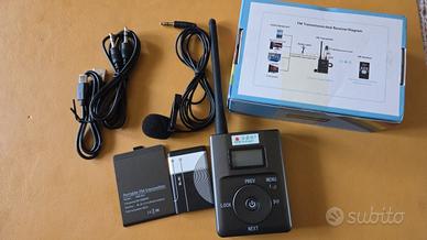 Nuovo con imballo originale programmabile da 60 a 108 Mhz ingresso Microfono, ingresso Aux, e lettore Mp3 scheda MicroSD. Raggio di azione circa 500 mt alimentazione con sua batteria ricaricabile tramite cavo USB C.
