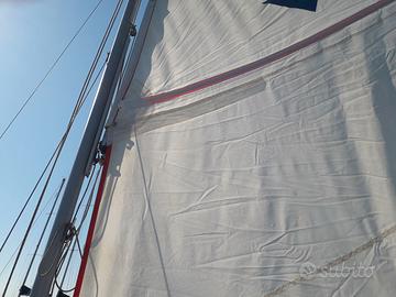 trimarano di colore giallo ocra del cantiere francese VIRUS BOATS, lungo 4.90, largo tre metri, facilmente smontabile e trasportabile. Armo alla portoghese con randa dotata di picco e fiocco. Dotato di copriranda con cerniera, cuscineria, ancora con cima, salvagente anulare e a corpetto, piccolo motore fuoribordo elettrico, remi, tasche portaoggetti. Possibilità di avere motore fuoribordo 3.3 HP Mercurj due tempi. Visibile presso la lega Navale di Trapani