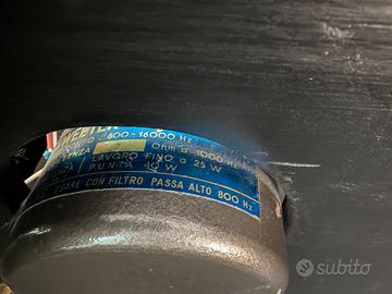 Per sfoltimento collezione personale. Trombe RIEM Milano anni 60, perfette, driver in alnico, inserite in appositi cabinet comprese di filtro e attenuatore. Misure cabinet 30x22x20 Io le usavo come medio. Spedisco in tutta Italia tramIte MBE NON HO TUTTO SUBITO! Si ribordano woofe, plinth in massello per Thorens, Lenco, Garrard, etc etc... abbiamo elettroniche tipo hi fi, hi end vintage, come: amplificatore, lettore cd, tuner, preamplificatore, finale, monofonici, valvole, giradischi, clamp, pressadisco, cavi hi end di segnale, potenza e rete. Possibile spedizione con corriere. Se volete guardate anche gli altri miei annunci. Grazie mille e buoni ascolti a tutti.